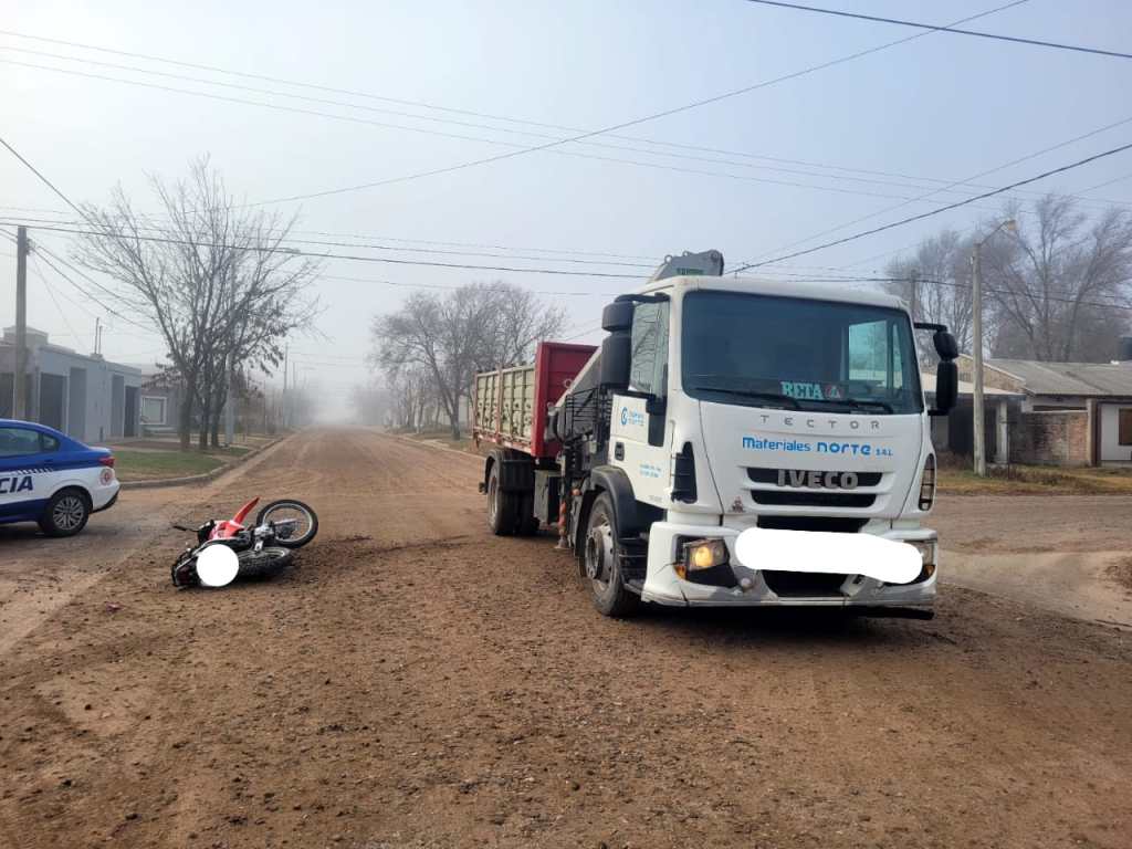 En el día de la fecha alrededor de las 10:00hs, se produjo un accidente de tránsito en calle Los Patricios y Pasco. En el lugar personal policial se entrevisto con un hombre de 45 años de edad el cual se conducía en un camión FIAT IVECO, por calle Pasco y al llegar a la intersección con calle Los Patricios colisiona con una motocicleta HONDA XR, conducida por un hombre de 26 años de edad. Se hace presente el servicio de emergencias el cual traslada al conductor de la motocicleta al nosocomio local para su mejor atención. Entregando las correspondientes actas de rigor en sede de unidad judicial