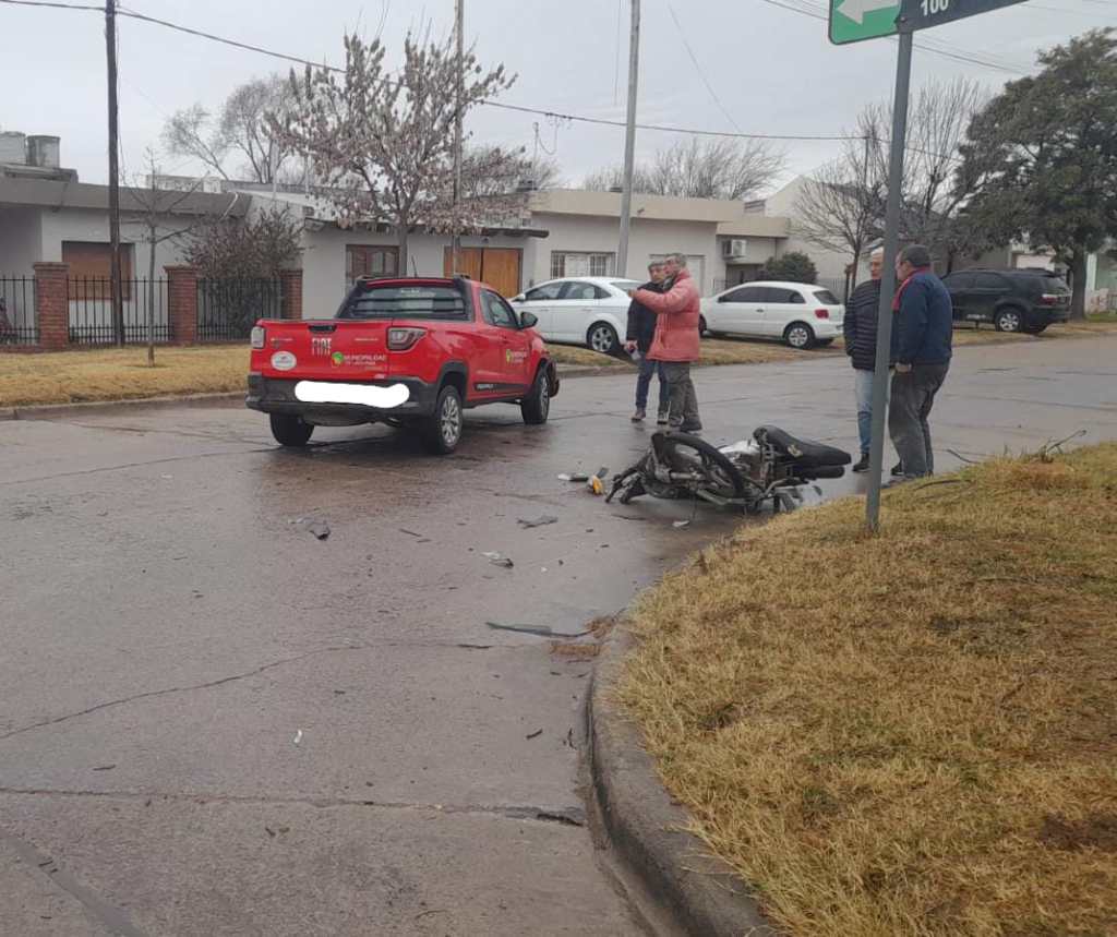 En el día de la fecha alrededor de las 12:27hs, se produjo un accidente de tránsito en calle Chazarreta y Carlos Gardel entre una motocicleta Guerrero Trip, conducida por un hombre de 23 años de edad quien circulaba por calle Chazarreta en sentido Oeste-este y al llegar a la intersección con calle Carlos Gardel es colisionado por una camioneta Fiat Strada, conducida por un hombre de 63 años de edad, quien circulaba en sentido Norte-sur por la calle antes mencionada. Se hace presente servicio de emergencias trasladando al conductor de motocicleta al nosocomio local quien aducía un dolor en hombro izquierdo. Entregando las correspondientes actas de rigor en sede de Unidad Judicial.-