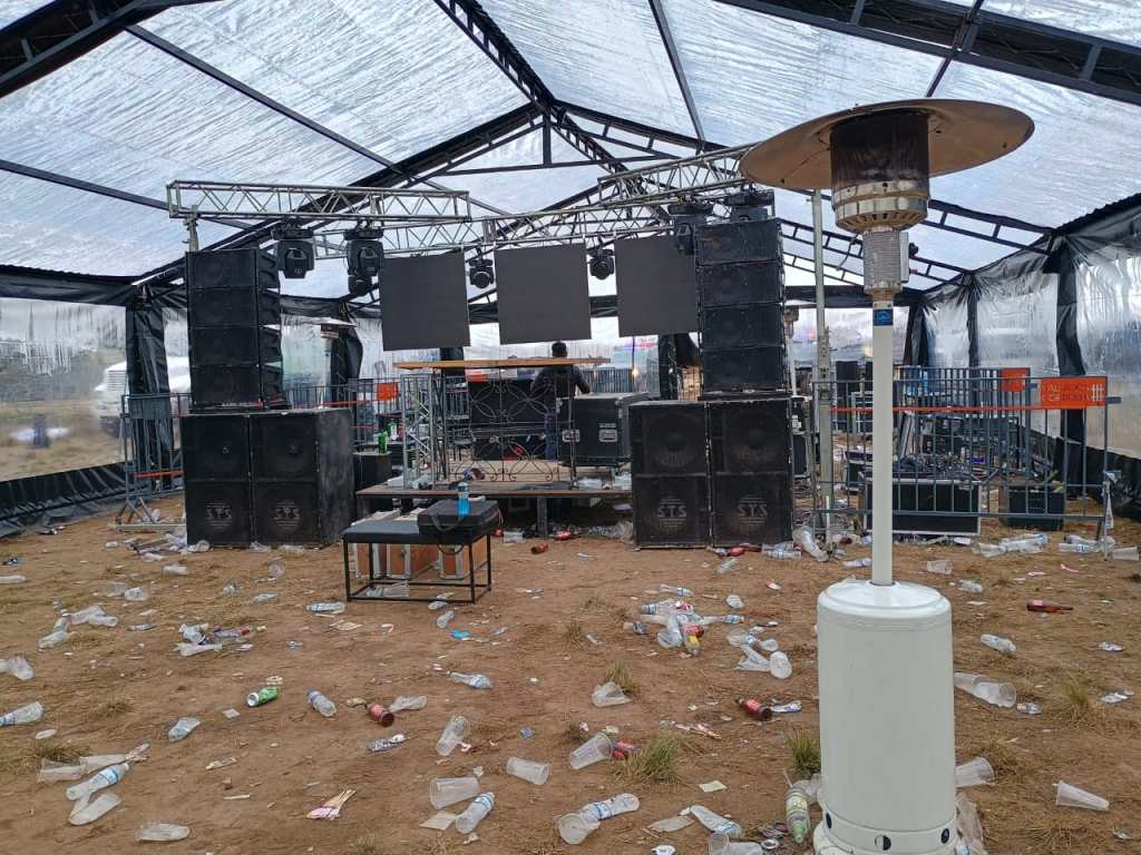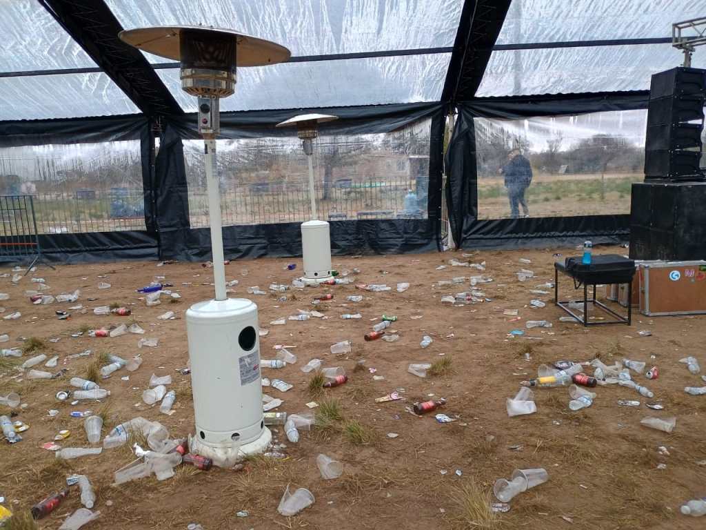 Recientemente, en un campo ubicado en el Km 25 de Chacra de La Merced, se procedió a desarticular a un grupo de 500 personas aproximadamente, quienes se encontraban en una fiesta electrónica clandestina. Al lugar se hizo presente personal policial de la Dir. Gral. de Seguridad Capital conjuntamente con efectivos de la Departamental Colón, Guardia de Infantería y FPA, quienes *secuestraron 70 vallas, 16 baños químicos, 6 barras de bebidas, 36 juegos de living, 5 estufas a gas, equipos de sonido, una carpa estructural de 20 x 10 mts y un generador; además, varias dosis de cocaina, cogollos, cigarrillos y envoltorios de marihuana*. Cabe consignar que el procedimiento culminó con *5 personas detenidas quienes fueron trasladados a disposición de la justicia*. El operativo se concretó luego que el ministerio de Seguridad, recibiera información anónima y tras una ardua tareas investigativas, se pudo establecer la zona donde se desarrollaba el encuentro.