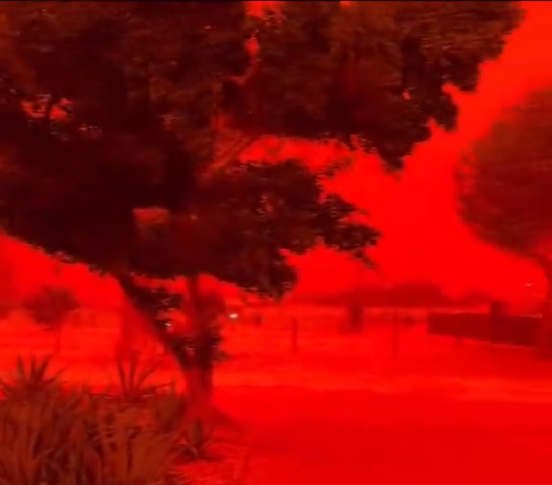 🌪️ El fenómeno ocurrió antes de la llegada del ciclón Narelle, cuyos fuertes vientos levantaron enormes cantidades de polvo, tiñendo el cielo de un tono rojizo intenso y reduciendo la visibilidad.